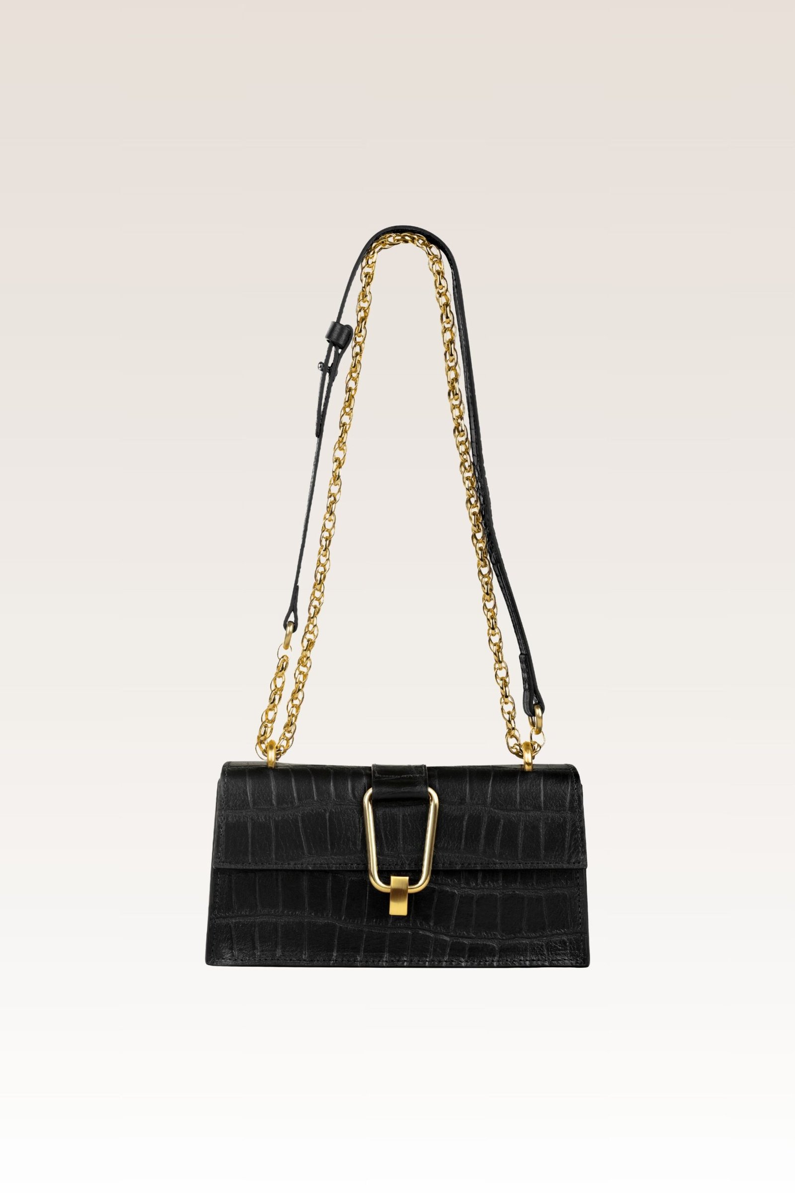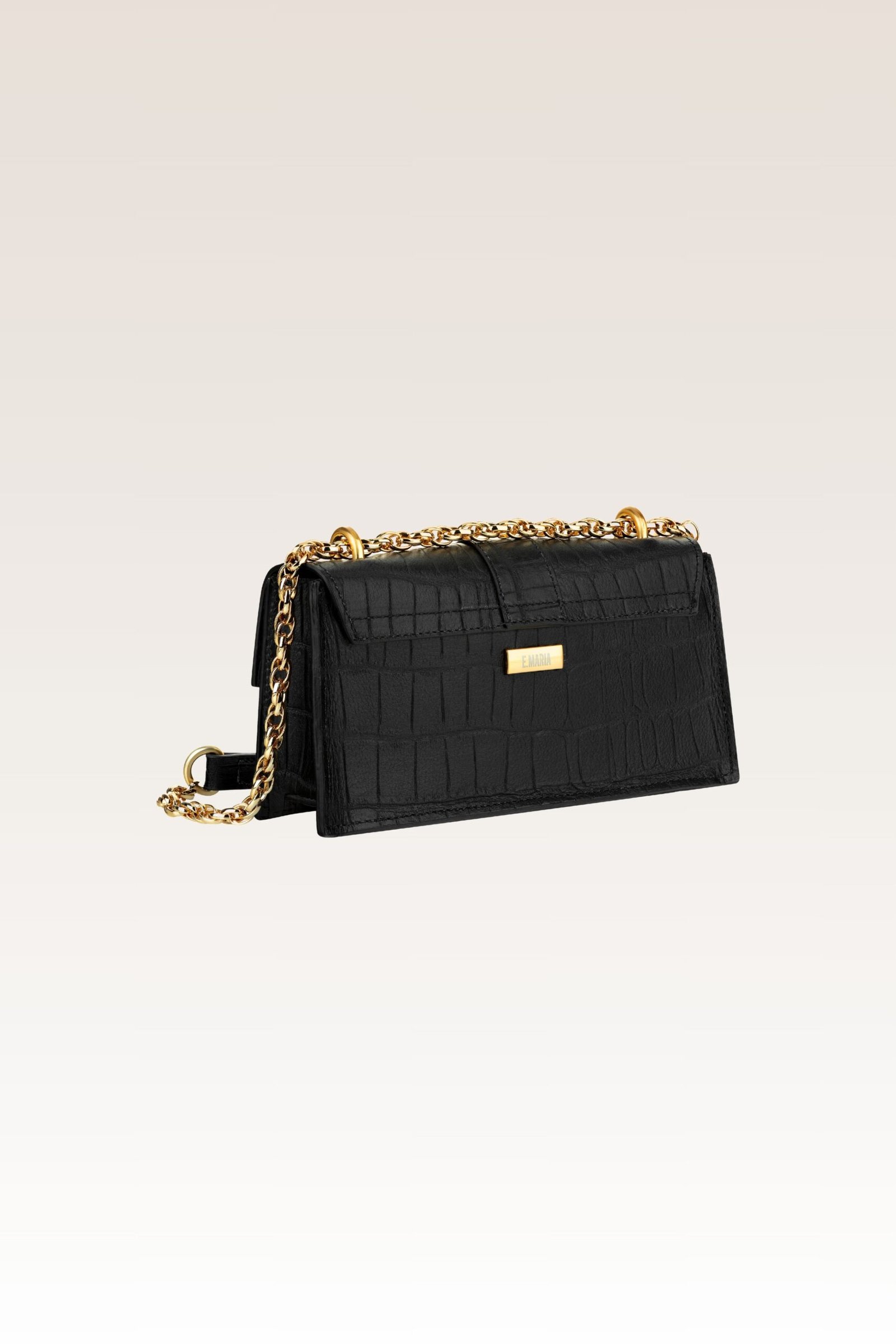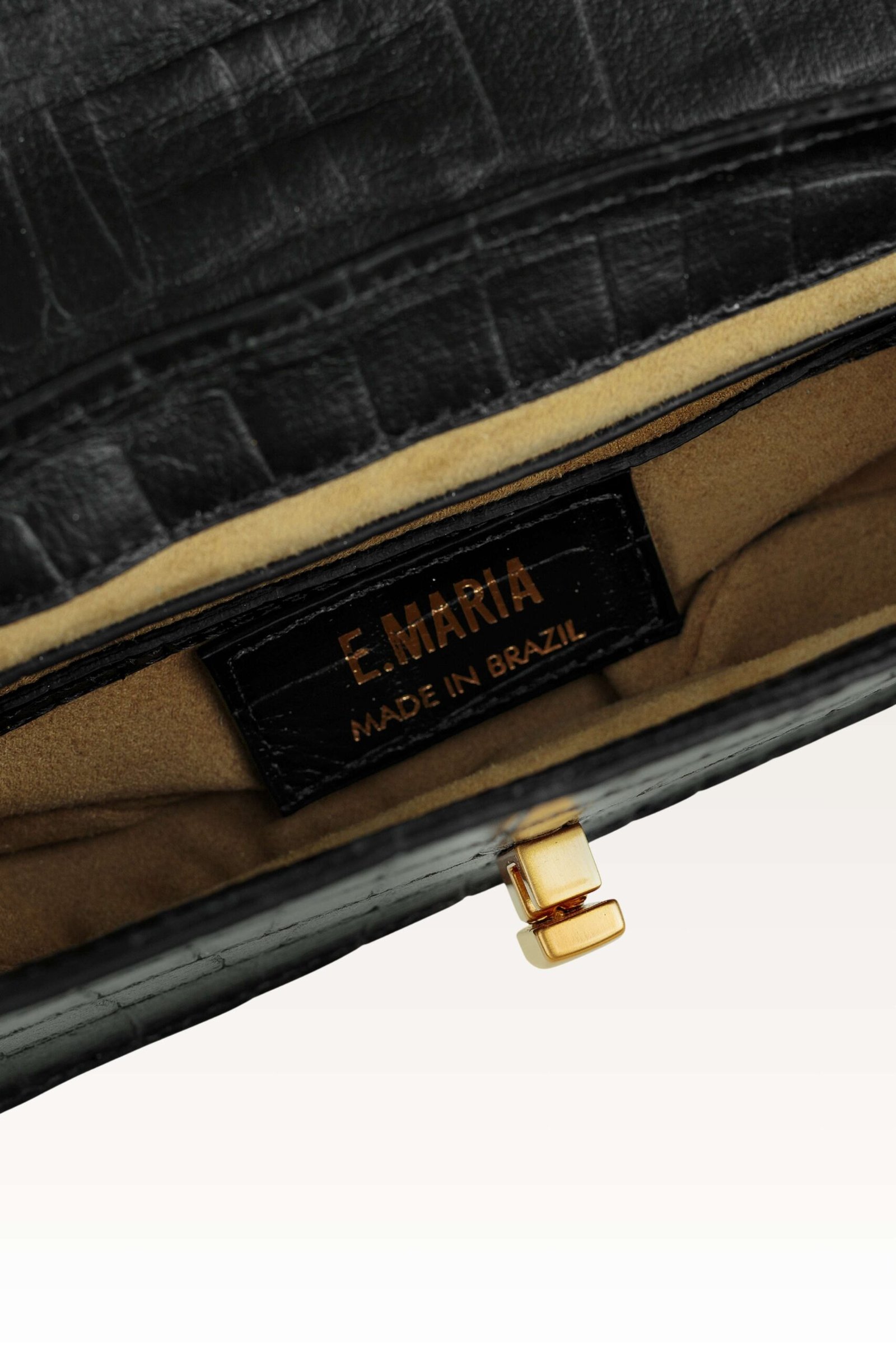 Lumière – Party Bag Croco. Confeccionada em couro de alta qualidade, apresenta estrutura firme e acabamento impecável. O interior em camurça revela uma textura suave, que contrasta delicadamente com a robustez externa. Metais recebem banho em ouro 18 escovado, conferindo brilho sutil e sofisticação atemporal. Feito no Brasil.Bolsa