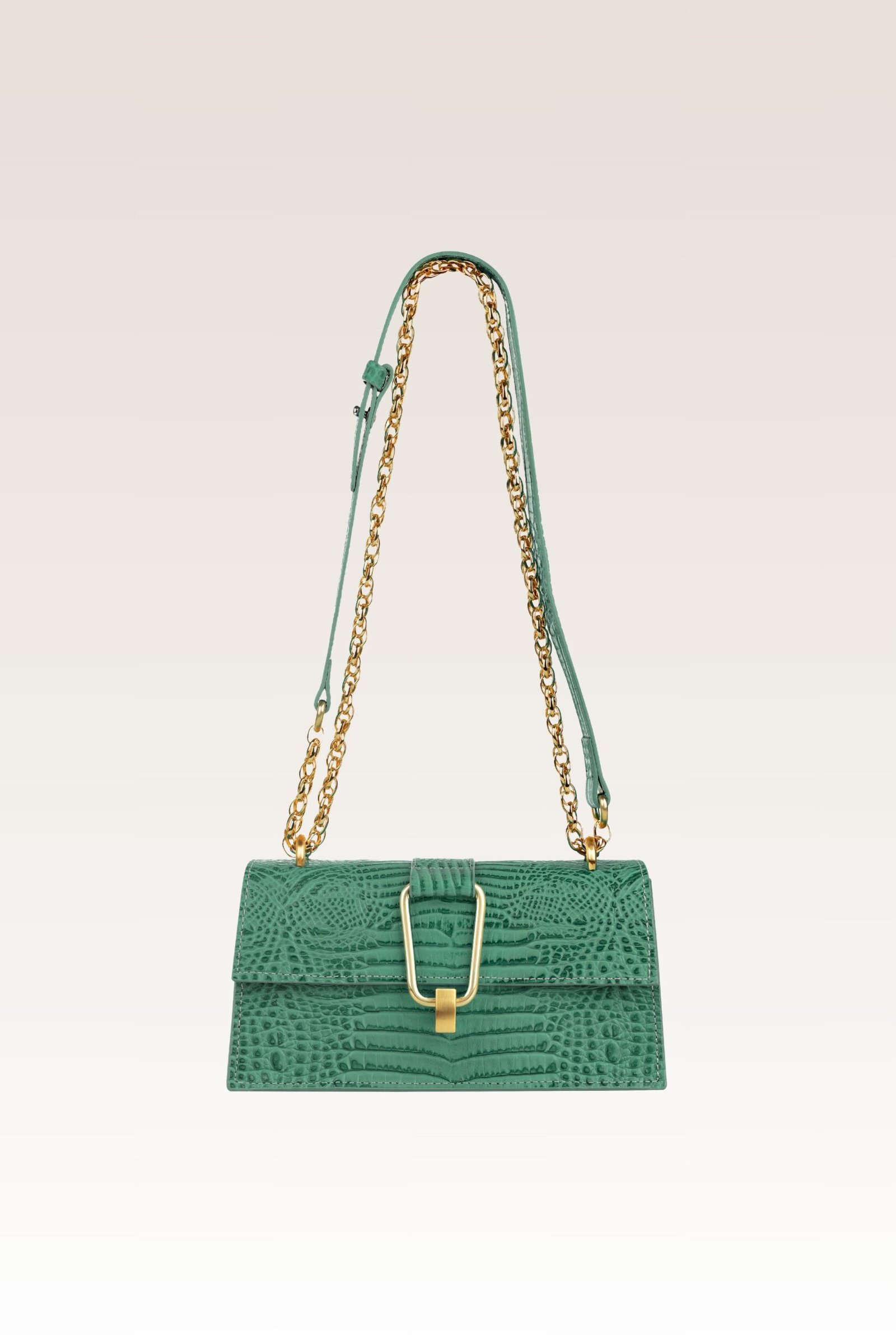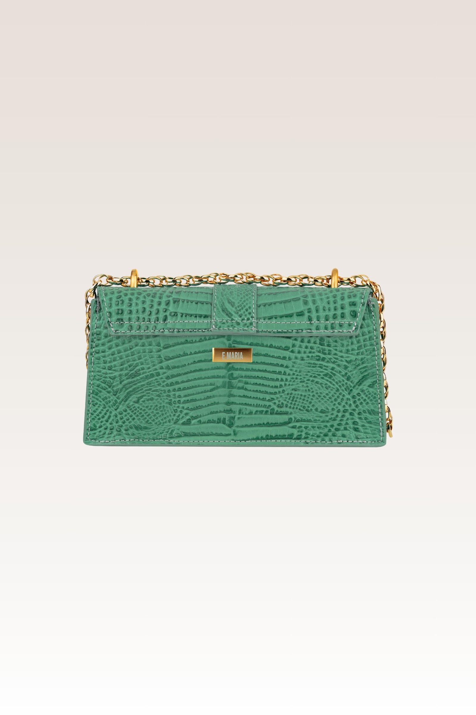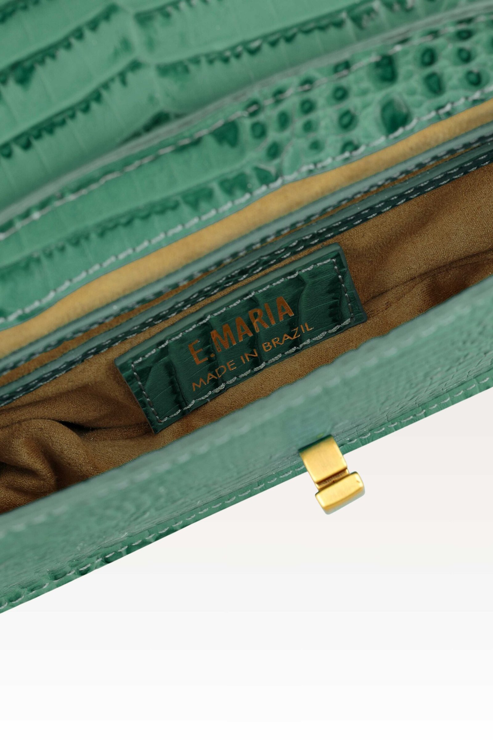 Lumière – Party Bag Croco. Confeccionada em couro de alta qualidade, apresenta estrutura firme e acabamento impecável. O interior em camurça revela uma textura suave, que contrasta delicadamente com a robustez externa. Metais recebem banho em ouro 18 escovado, conferindo brilho sutil e sofisticação atemporal. Feito no Brasil.