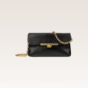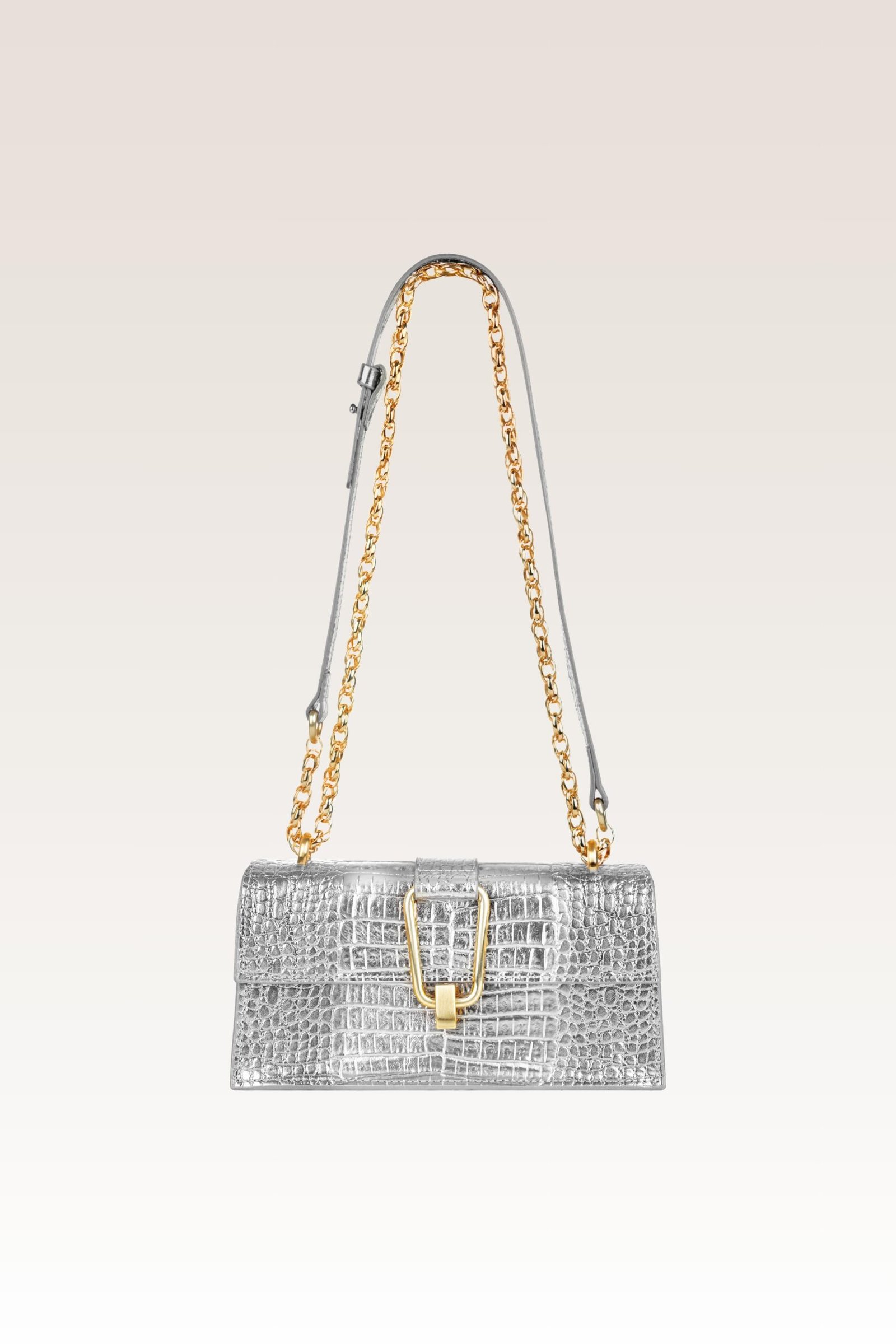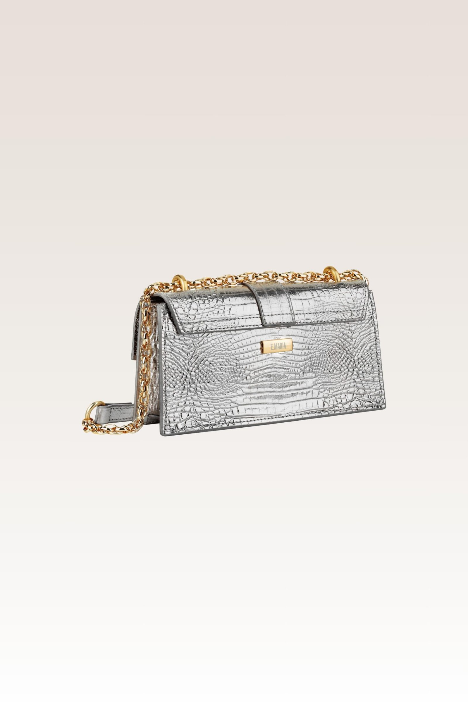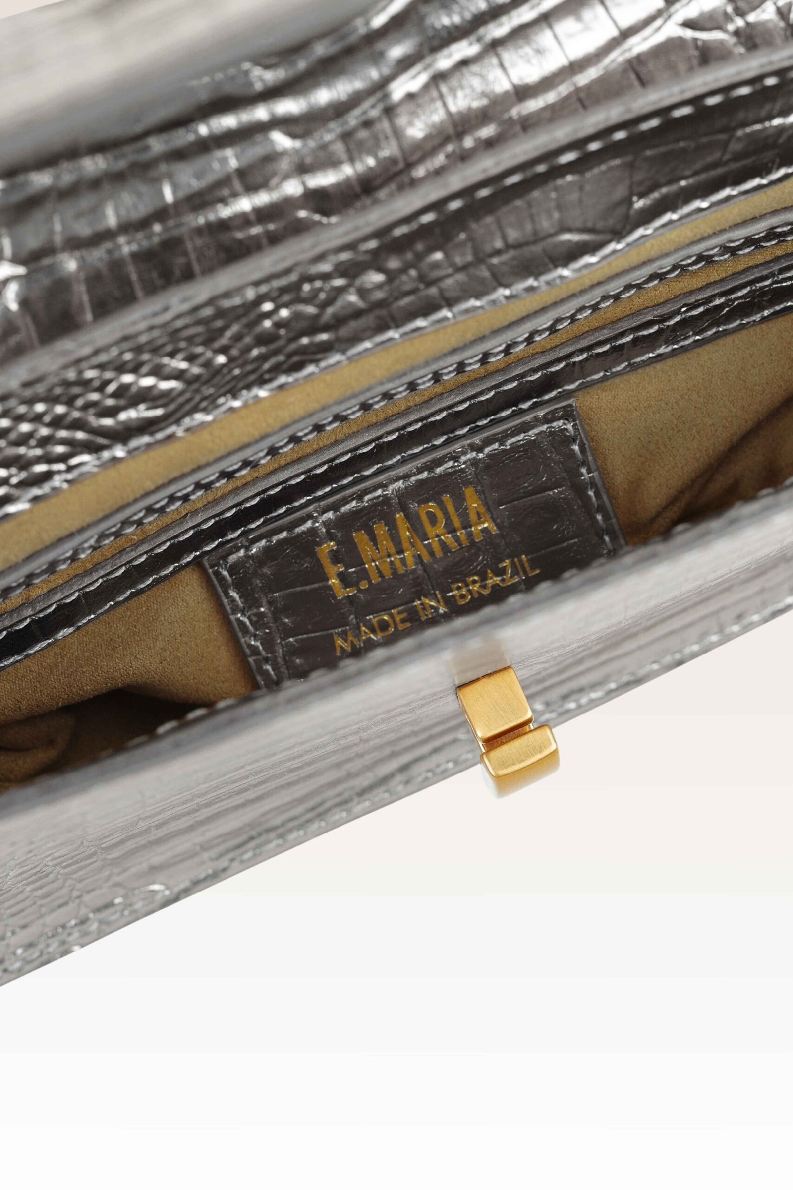 Lumière – Party Bag Croco. Confeccionada em couro de alta qualidade, apresenta estrutura firme e acabamento impecável. O interior em camurça revela uma textura suave, que contrasta delicadamente com a robustez externa. Metais recebem banho em ouro 18 escovado, conferindo brilho sutil e sofisticação atemporal. Feito no Brasil.