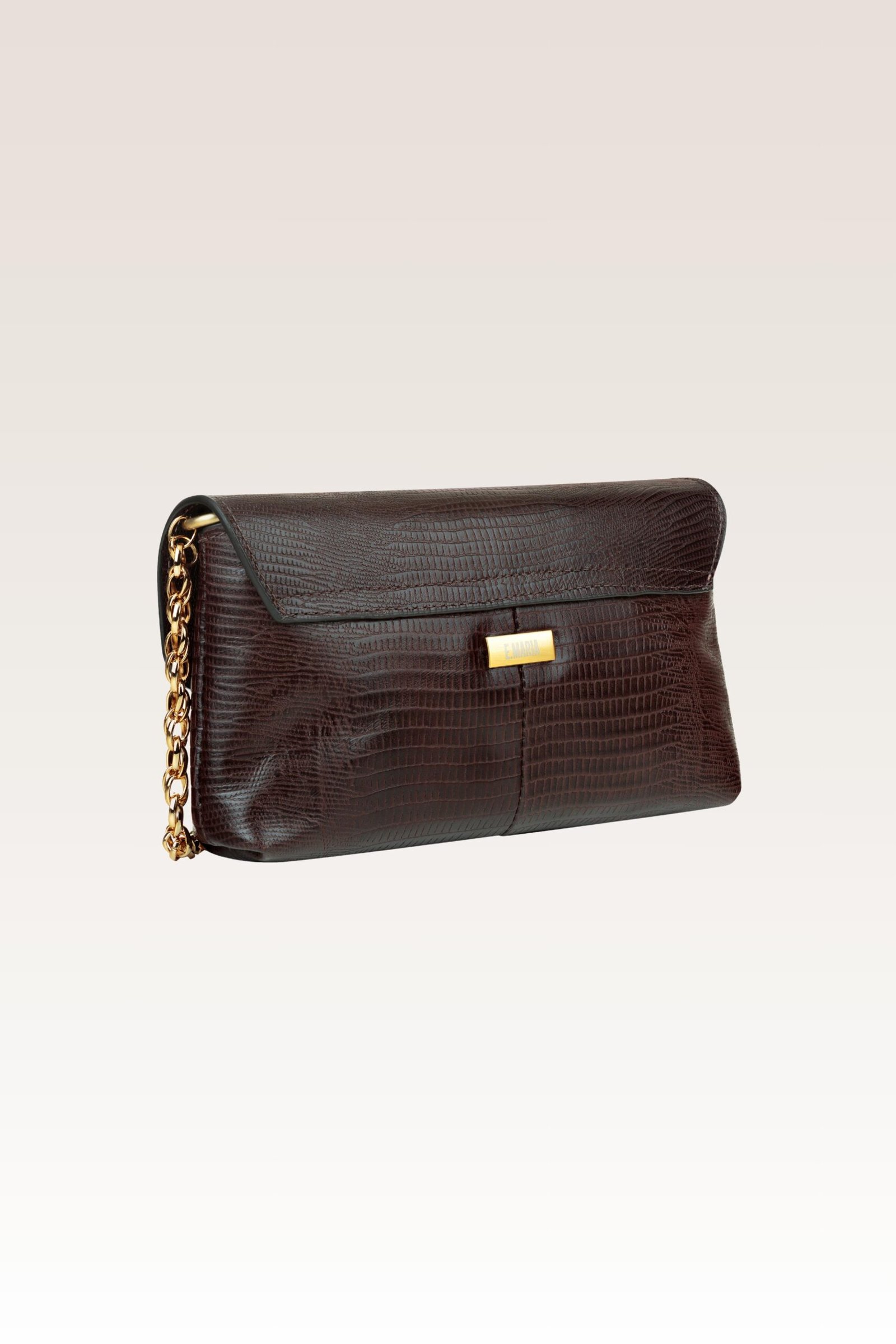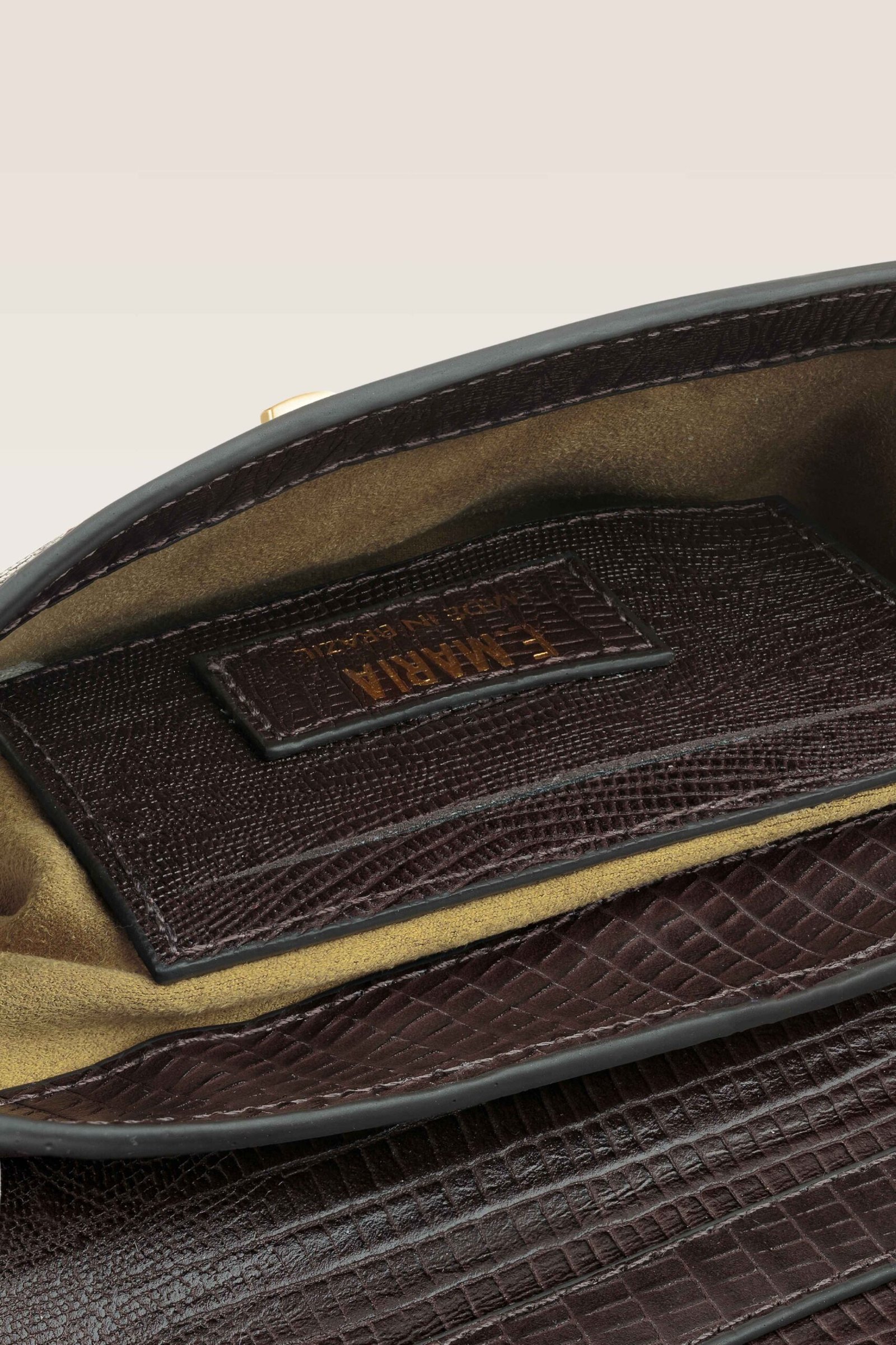 Bolsa em couro Croco Café. Forro Camurça verde. Bolso interno. Alças: uso à mão, no ombro ou transpassada. Produto artesanal: medidas podem variar. Metais com acabamento banho em ouro 18 escovado. Feito no Brasil.
